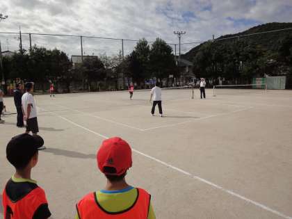 体育振興会のソフトテニス部のみなさんに,デモンストレーションのゲームを披露していただきました。ルールや審判の仕方についても丁寧に教えていただきました。