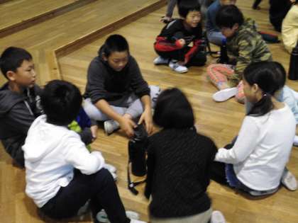 3日目朝の集いは,オリエンテーションホールで行いました。体操をして先生のお話を聞いた後,グループごとに健康観察をしました。