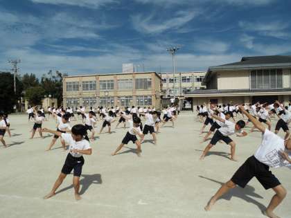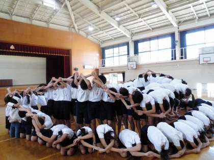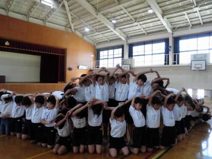 5・6年生の組体操は,初めて運動場に出て裸足で曲に合わせて演技をしました。その後,体育館で波の練習をしました。