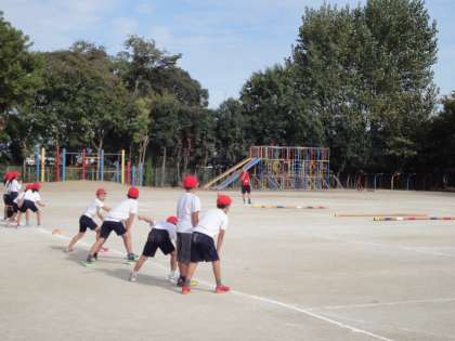 3年生は,団体競技として「棒引き」をします。まずは,どの位置に並んだらよいのかを確かめました。