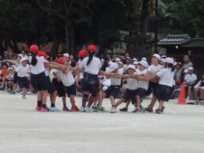 運動場の真ん中に置かれた7本の棒を引っ張り合う棒引き。どの棒を狙うのか,どこに助けに行くのか・・・などの作戦が,勝敗の重要なカギとなりました。