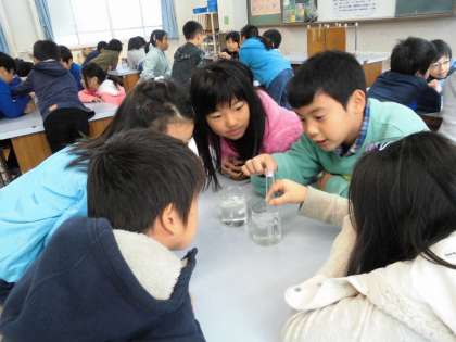 「ものの温度と体積」で試験管に閉じ込めた空気を温めたり冷やしたりしました。石鹸の膜が膨らんだりへこんだりして驚きました。