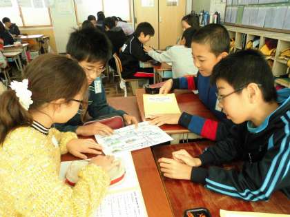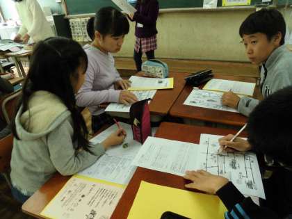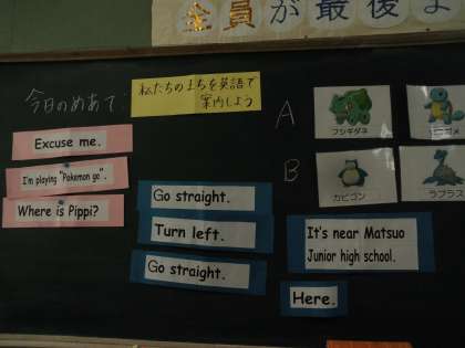 松尾中学校の英語の先生に来てもらって学習しました。「私たちのまちを英語で案内しよう」という内容で「まっすぐに行く」「右に曲がる」「左に曲がる」などを英語で練習しました。