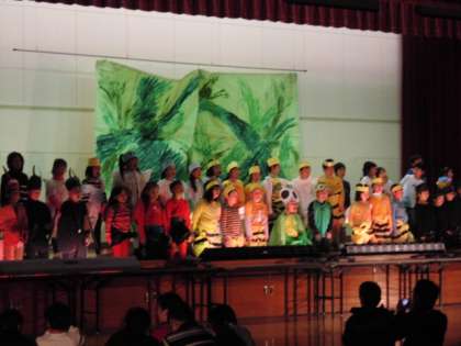 小さい虫たちと同じ大きさになってしまった子ども達。虫たちといろいろな競技で争います。しかし,いつもは強気な子ども達も全く勝てません。そうです。ここは虫たちの世界。力持ちのアリに丸まるのがだれよりも上手なダンゴムシ。生きていくためにそれぞれの特長をもつ虫たちには,小さくなった人間は全く勝てないのです。ところが,カエルの登場で虫たちの様子が一変。カエルにおびえる虫たち。それを救ったのが人間の子ども達でした。このことがきっかけでもとの世界にもどった子ども達は,むやみに虫をいじめなくなりました。3年生らしいほのぼのとした劇でした。