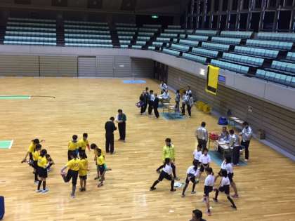 試合前のストレッチとアップです。六年生を中心に練習をして試合に向けて気持ちと体の調整をしています。