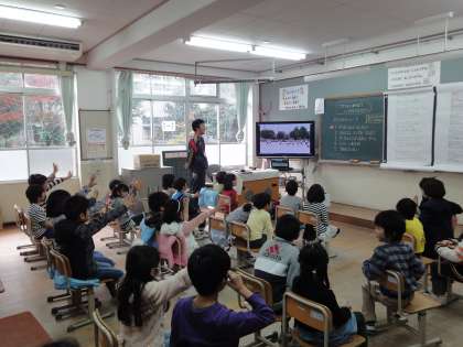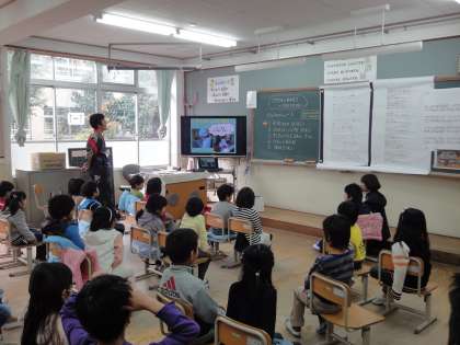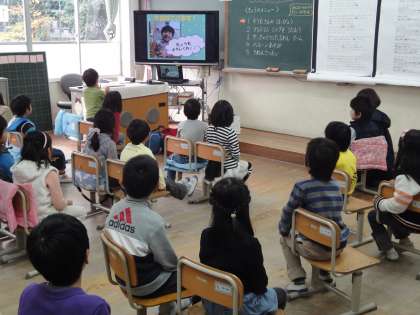 最初に,西総合支援学校でどんなふうに過ごしているのか,学校生活の様子を紹介してくれました。その後,嵐山東小学校の運動会と学芸会の映像を一緒に見ました。