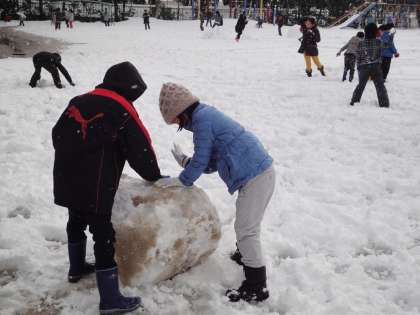 日曜日から降り続いた雪が,15センチほど積もりました。登校してきた子どもたちは,教室にかばんを置いてすぐに運動場に出てきました。雪合戦をしたり,雪だるまを作ったり…。どの子も大はしゃぎです。