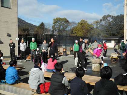 2月4日(土)少年補導やおやじの会,PTA本部,地域の方にお世話になって親子ふれあい餅つき大会が実施されました。