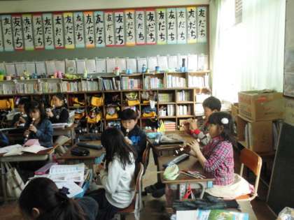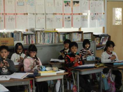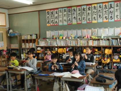 3年2組で「雪のおどり」という曲をリコーダーで輪奏しました。音の重なりに気をつけて演奏することができました。