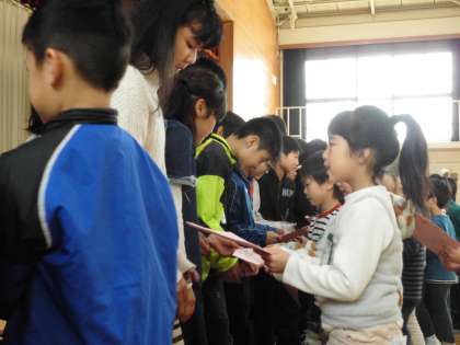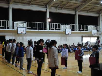 プレゼント交換も行いました。在校生からのプレゼントは,たてわりグループで作ったメッセージカードを渡しました。また,6年生からはすてきな「プリント入れ」を頂きました。最後に去年から始めた全校合唱をして,すてきな歌声をみんなで響かせました。