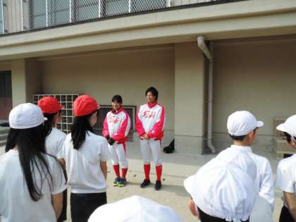 クラブ活動の最終日,女子プロ野球チーム「京都フローラ」の田口選手・三浦選手が来校してくださり,ティーボール教室が開催されました。「京都フローラ」の選手に来ていただくのは3回目ですが,運動場で実技を実施できるのは今回が初めてです。