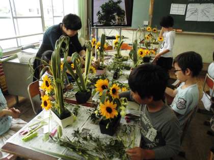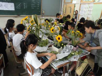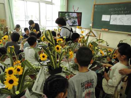 次にひまわり,スプレーカーネーション,アセビをいろいろな高さにさして作品を完成させました。