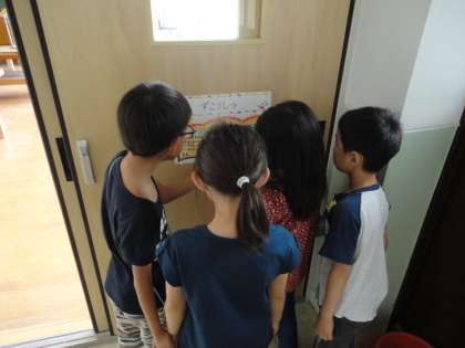 特別教室の入口には,2年生が作ってくれた看板が取り付けてありました。2年生が読んで説明をしてくれました。2年生のお兄さん,お姉さんのおかげで,楽しい学校探検になりました。