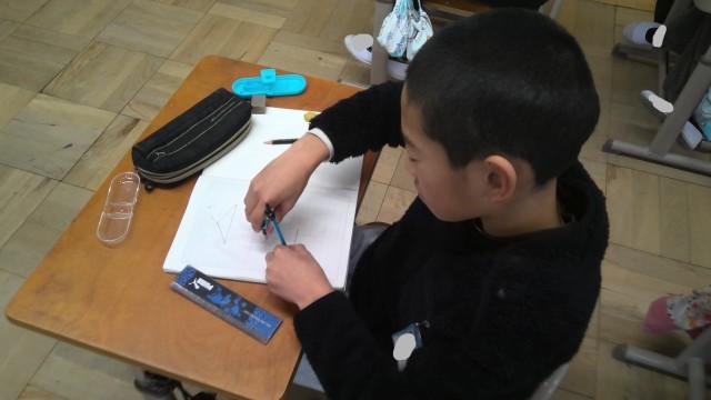 算数の学習では、三角形の描き方について考えました。定規をやコンパスを使って、どのように描けばよいのか考えていました。三角形を描くときにも、コンパスが使えるときに驚き、色んな三角形を描いていました。