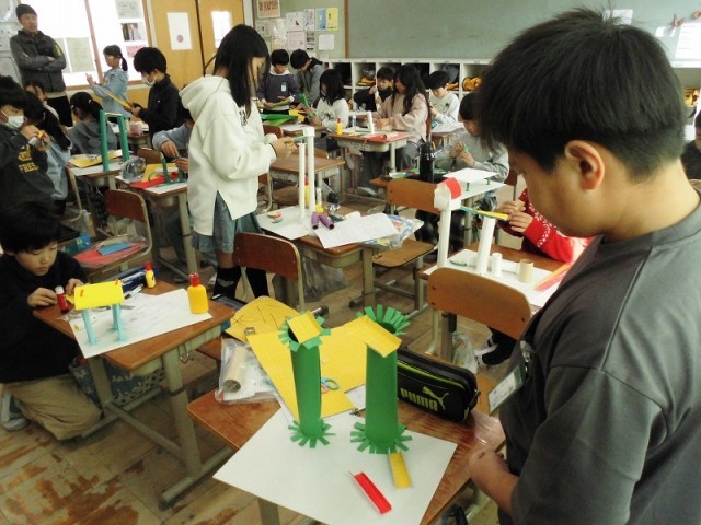 図画工作の学習では「コロコロガーレ」という工作に取り組んでいます。ビー玉を転がすコースづくりをしています。どんなコースにするとおもしろいか、考えたり試したりしながら進めています。