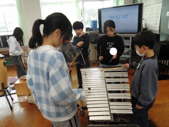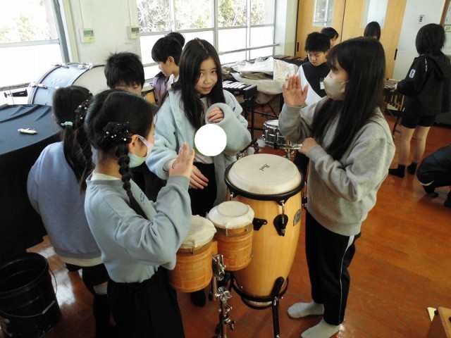 今日は音楽室で音楽の学習をしました。打楽器を演奏して、どんな特徴があるか確かめました。「金属の楽器は音がよくひびくなあ。」「皮の楽器はなんだかやわらかい感じの音がするなあ。」などと、話し合いながら演奏しました。
