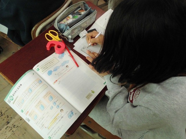 算数では、直方体の展開図について学びました。箱を開くと・・・と考えながら展開図をかきました。かけた展開図は切り取って組み立ててみました。