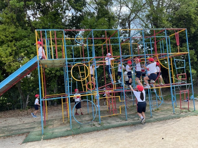 総合遊具の時間は、初めて上まで登れることが嬉しい様子でした。「すべり台楽しい!」「ちょっと怖いな。」などと言いながら安全に気を付けていました。