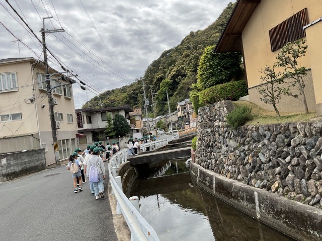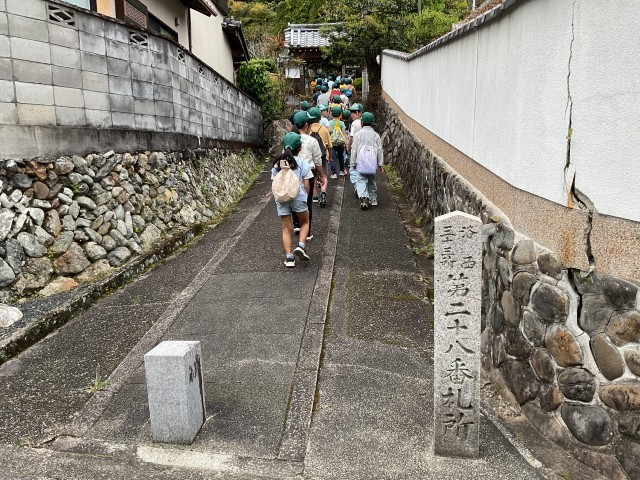 総合的な学習の時間の学習で校区内の散策に行きました。今回は校区の中の西側を歩きました。「山の方は坂になってるね。」「小さな川があるから、橋がたくさんあったよ。」「ここの枝垂れ桜はとってもきれいなんだよ。」などと気づいたことや見つけたことを話してくれました。次回は南側の松尾大社方面へ行きます。