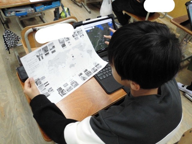 今日は社会科で世界にどんな国があるか調べました。地球儀やタブレットを使って確かめました。