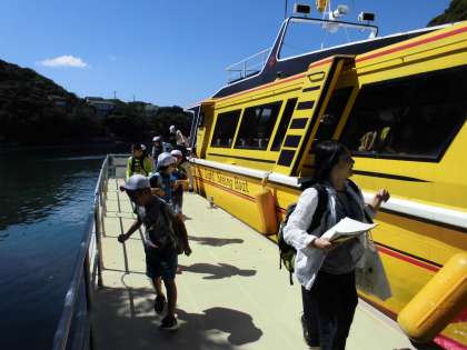 バスで2時間半ほど行くと,賢島港に到着しました。ここからは船に乗ってなかよし港へと向かいます。しばらく船に揺られると,みさきの家が見えてきました。さあ,活動開始です。楽しみな3日間の始まりです。
