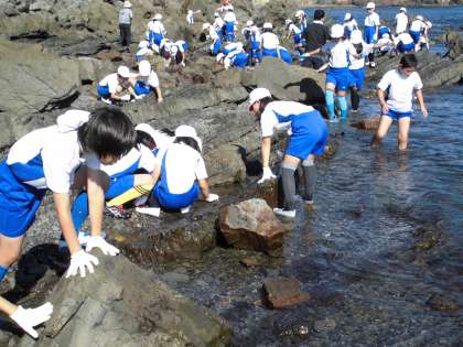 宮崎浜で磯観察を行いました。どんな生き物がいるのか楽しみしながら,浜へと向かいました。天気がいいので,水がかかっても大丈夫。いつの間か全身ずぶぬれになっている児童もいました。一生懸命探していたので,あっという間に時間が過ぎていきました。