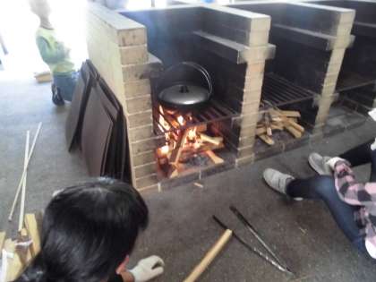 鍋の準備が出来上がり,いよいよ火をつけます。暑い中,かまど係の児童が火を保ちます。すると,おいしいすき焼き風煮ができあがりました。いかがでしょうか。