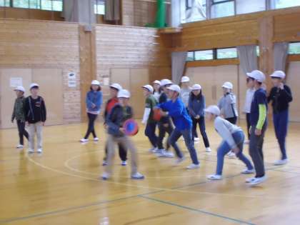 ドッジビーというやわらかいフリスビーを使って,ドッジボールのような遊びをしました。
