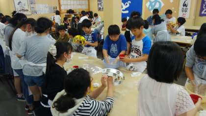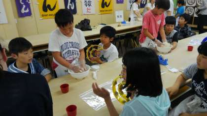 小麦粉と塩水を混ぜて生地を作っていきます。混ぜるのがなかなか大変で、力が必要です。最初は手でこねていきます。友達と交代しながらこねこねこねこね。最後は足で体重をかけながら仕上げていきます。音楽に合わせてリズムよく進めていきます。