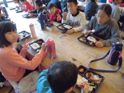 ラインOLから戻ってきたらお昼ご飯です。たくさん歩いたのでおなかも減っています。今日は寒くなってきているので,食堂でお弁当を食べました。ハンバーグの入ったおいしいお弁当でした。