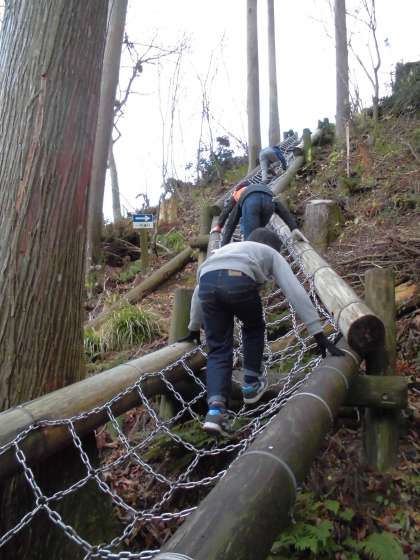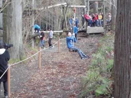 冒険の森は,滑りやすいところなどは避けて,できるところに挑戦しました。ロープを持ちながら丸太の上を歩いたり,高いところまで登って行ったりとスリリングな場所もあり,友達と協力したり声を掛け合ったりしながら進みました。山の上から大きな声を出して「ヤッホー」と叫んでいる児童の姿も見られました。