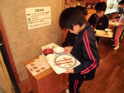 班ごとでごちそうさまをすると自分たちで片付けをします。食器以外のごみとゼリーの容器を分け,最後に自分たちで軽く洗います。3日目なので,手慣れたものです。後片付けは完璧です。