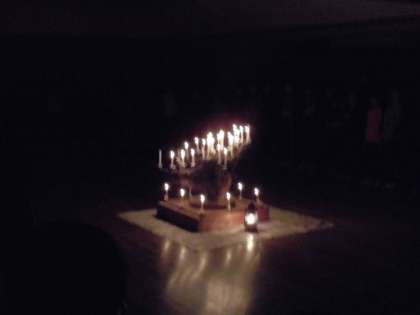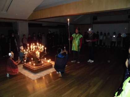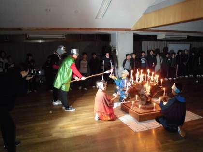 山の家の大きな行事の一つであるキャンドルファイヤーの時間となりました。暗い室内にみんなが入場し,しばらく待っていると,火の神と火の子が登場しました。火の神は日本語が話せず,通訳と一緒に入ってきて,火の子に神聖なる火を渡し,火の子がキャンドルに火を灯しました。さあ,いよいよ楽しい時間の始まりです!