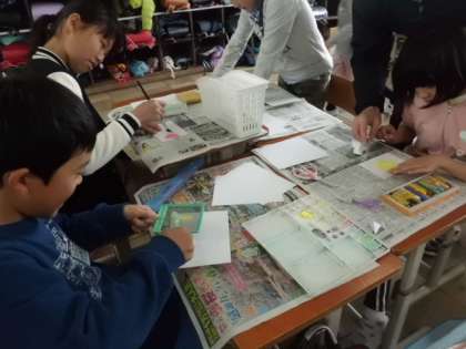 図画工作の学習で,自分の今の気持ちをいろいろな技法を使って表しました。一つの技法だけでなく,二つ以上の技法を合わせたもようもたくさんありました。同じものは一つもなく,みんなの気持ちを表した素敵な「心のもよう」が出来上がりました。