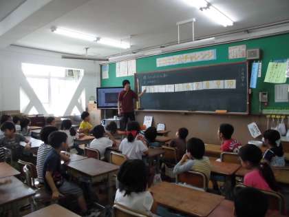 いろいろなフルーツが描かれた絵を見て,「いくつかなクイズ」に答えたり,「Ten steps」という歌を歌ったりしました。