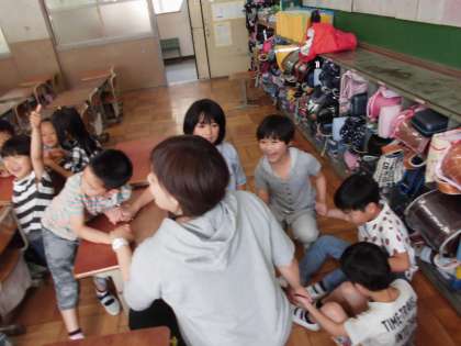仲間集めゲームでは,先生の言った数で仲間を作り,輪になって座りました。