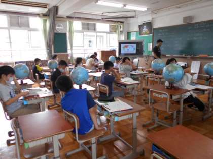 社会科では,地球儀を使って世界の国々の学習をしています。