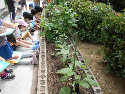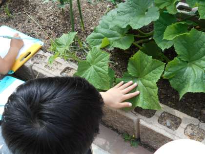 今回は,2年生の畑で育ててる野菜の観察をしました。