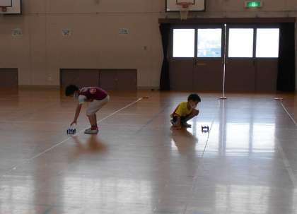 理科「ゴムや風の力」の学習を体育館で行いました。