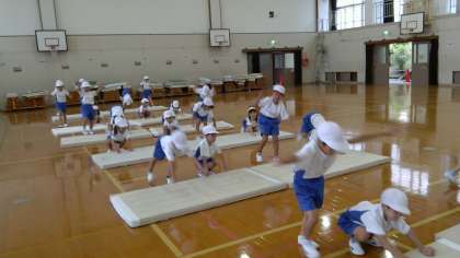 マットの安全な運び方や片付け方やマットを使った遊びを学習しました。