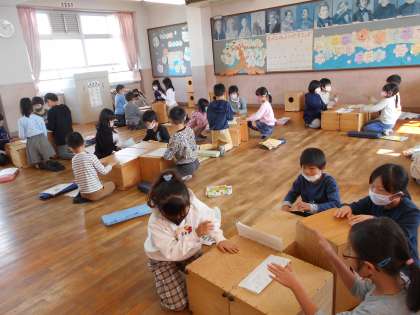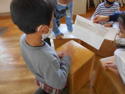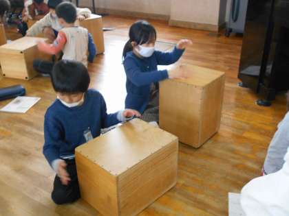 前回作ったおまつりのリズムを,カホンを使って演奏しました。