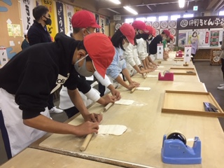 …ということで、楽しみにしていたうどん打ち体験が始まりました。子どもたちは腰にエプロンを巻いて、気分はすっかりうどん打ち職人さんです。丁寧に教えてくださる先生方の言葉をしっかりと聴きながら、うどん打ちの技術を習得していく子どもたち。その目は真剣そのものです。