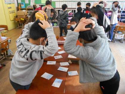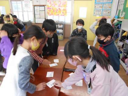 前回の授業で作った音訓カルタを使って