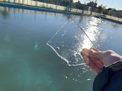およそ1cmの薄い氷の「まく」が,プール全面にできていました!