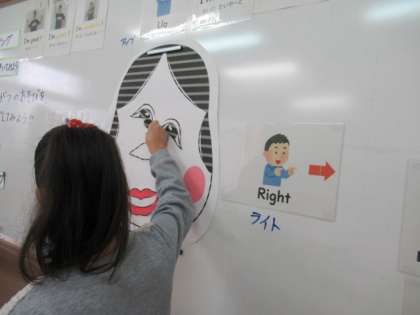 「up(上へ)」「down(下へ)」「right(右へ)」「left(左へ)」の言葉を使って,顔を完成させていきます。