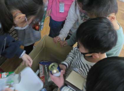 生活科「あそんで ためして くふうして」の学習では,いらなくなった廃材をつかって,みんなであそべるおもちゃを作ります。