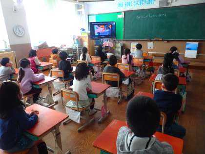 この日は,まず『給食調理員さんの一日』という動画を見て,調理員さんがいつもしてくださっていることを,子どもたちは初めて見ることができました。