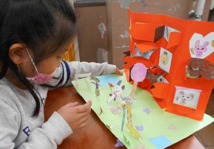 カッターナイフで切り開いた窓に好きなものを描いたり,建物の下に色々なものを作ったり…想像の世界が広がり,にぎやかになってきました。