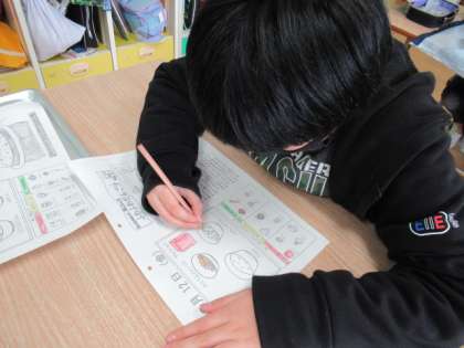 『しょうよう おてつだいがかり』さんは,きゅうしょくしつのまえにはってある『きゅうしょくカレンダー』に,きれいに色をぬってくれています。