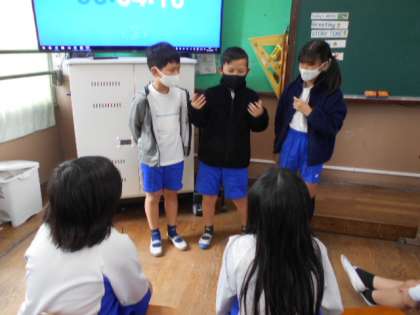 動物たちがかくれんぼしている様子をジェスチャーを使ったり,声まねをしたり,鳴き声を発したりして表現豊かに発表していました。